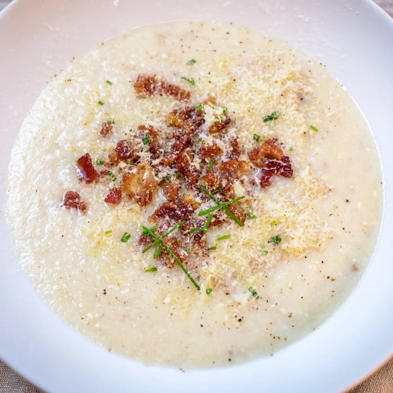 Soupe au parmesan riche et crémeuse, décorée de bacon doré et croustillant. Épingler