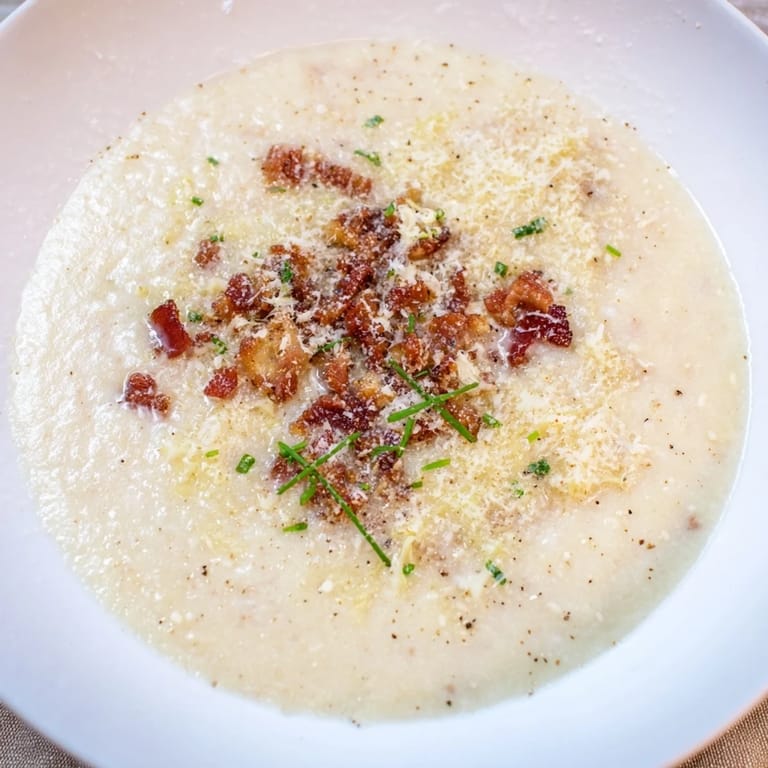 - Ladle the soup into bowls, top with crispy bacon, extra Parmesan, and chives if desired. Serve immediately.