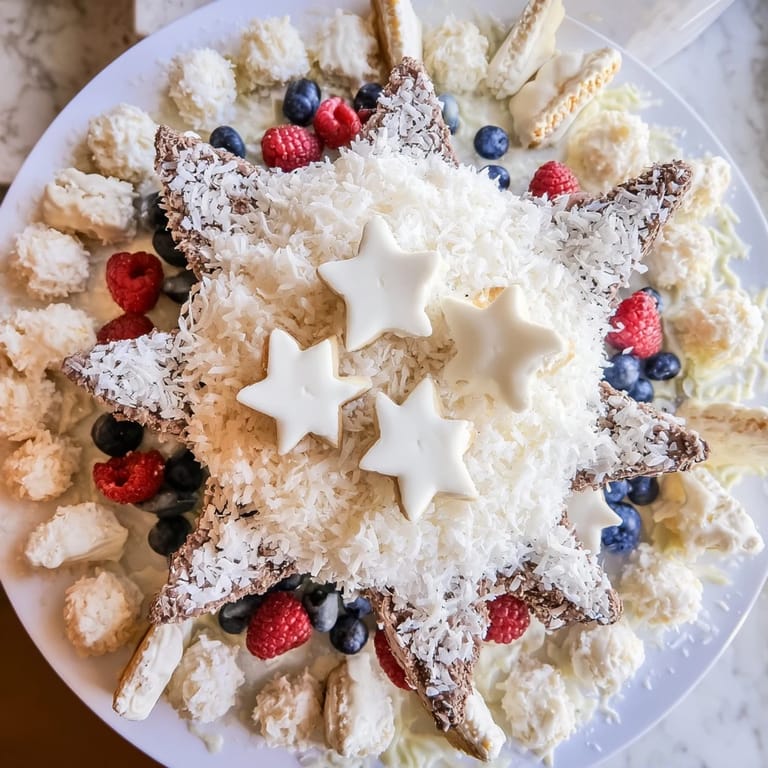 Épingler Un plateau de desserts festif et hivernal présentant un assortiment de douceurs disposées en forme de flocon de neige parfait pour les réunions de vacances et les occasions spéciales.