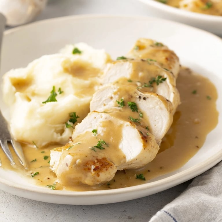 Épingler Des filets de poulet tendres nappés d'une sauce crémeuse à la moutarde de Dijon, accompagnés de purée de pommes de terre à l'ail riche et beurrée pour un repas réconfortant et savoureux.