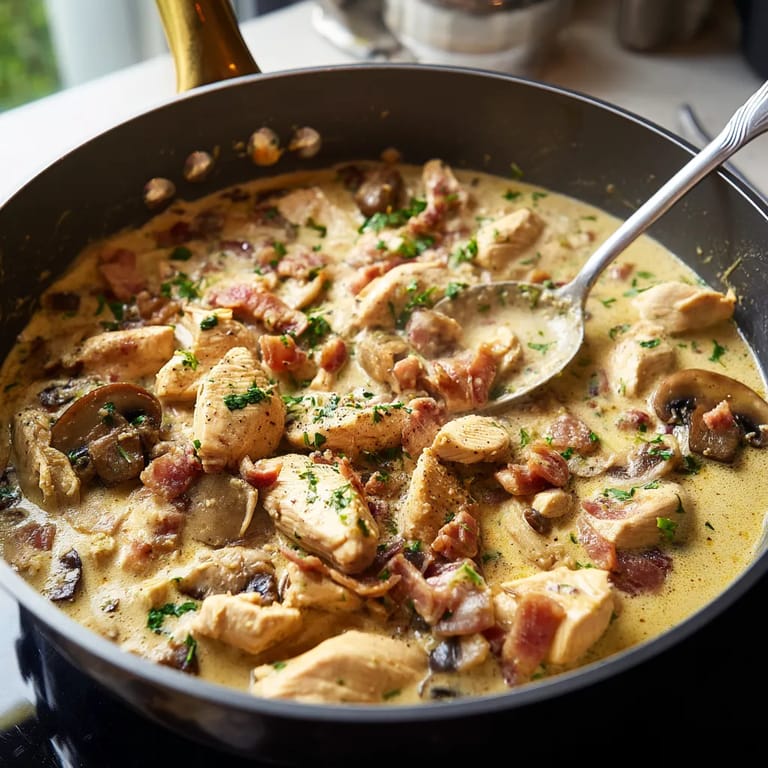 Épingler Cette recette d'émincés de poulet à la moutarde, lardons et champignons est devenue l'un de mes incontournables pour les soirs de semaine chargés. Un plat réconfortant qui combine des saveurs riches et crémeuses avec la simplicité d'une préparation en une seule poêle.
