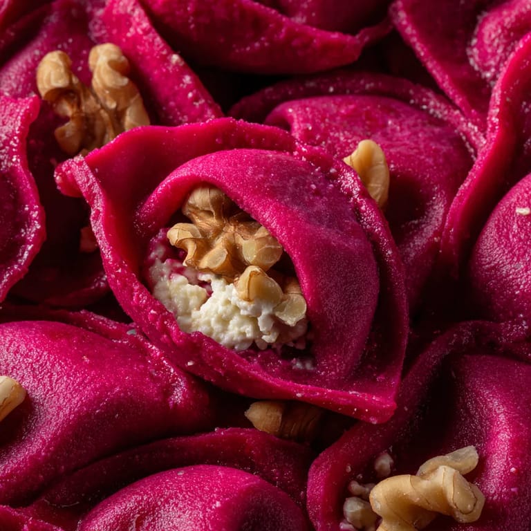 Épingler Ce plat de ravioles de betterave allie la douceur légèrement terreuse de la racine à la fraîcheur piquante du chèvre et au croquant gourmand des noix. C’est une recette pleine de charme, idéale pour un dîner coloré ou pour impressionner vos proches lors d’une occasion spéciale. Les teintes roses éclatantes font de chaque bouchée un véritable instant de fête autour de la table.