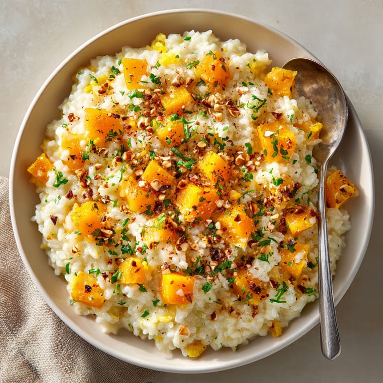 Épingler Ce risotto au potiron, parmesan et huile de truffe, parsemé de noisettes grillées, est une invitation à la gourmandise. Il transforme les saveurs automnales en un plat réconfortant, élégant et végétarien, parfait pour épater vos convives ou réchauffer un soir de semaine. La douceur du potiron rencontre la puissance du parmesan, le parfum de la truffe et le croquant des noisettes pour une expérience vraiment raffinée.
