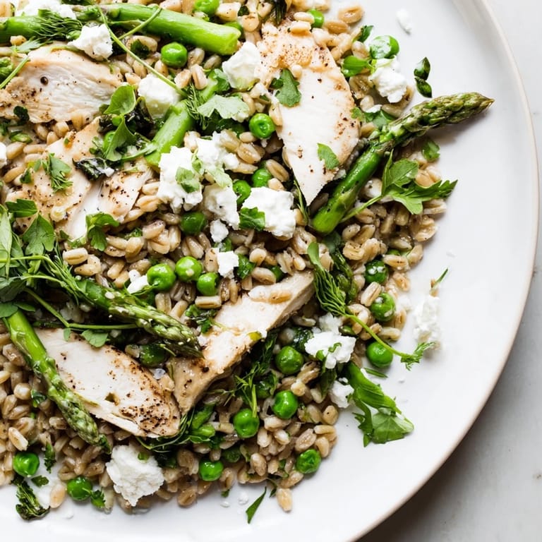 - Dans un grand bol, combinez le farro cuit, les tranches de poulet, les asperges blanchies, les pois et la roquette ou les épinards. Arrosez de vinaigrette et mélangez délicatement pour enrober tous les ingrédients.