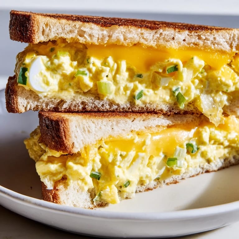 Épingler Une amie m'a apporté un sandwich œuf-fromage grillé lors d'une pause déjeuner étouffante, et j'ai été frappée par la simplicité géniale : la crème de la salade d'œufs se mélangeait avec le fromage fondu, tandis que le beurre dorait le pain en une couche croustillante. C'est devenu mon refuge culinaire, celui que je prépare quand je veux du réconfort sans complications. Ce sandwich n'essaie pas d'être élaboré—il n'a pas besoin de l'être.