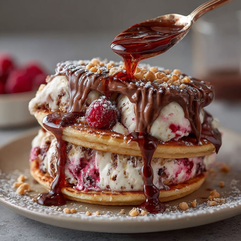 Épingler Ce dessert glacé réunit tout le plaisir des pancakes dorés maison et la fraîcheur fondante d’une glace marbrée à la framboise, le tout rehaussé par la gourmandise du chocolat blanc et d’une coque croquante au chocolat au lait. C’est la gourmandise estivale idéale, surprenante et ludique, qui attire tous les regards et fait l’unanimité à la première bouchée.
