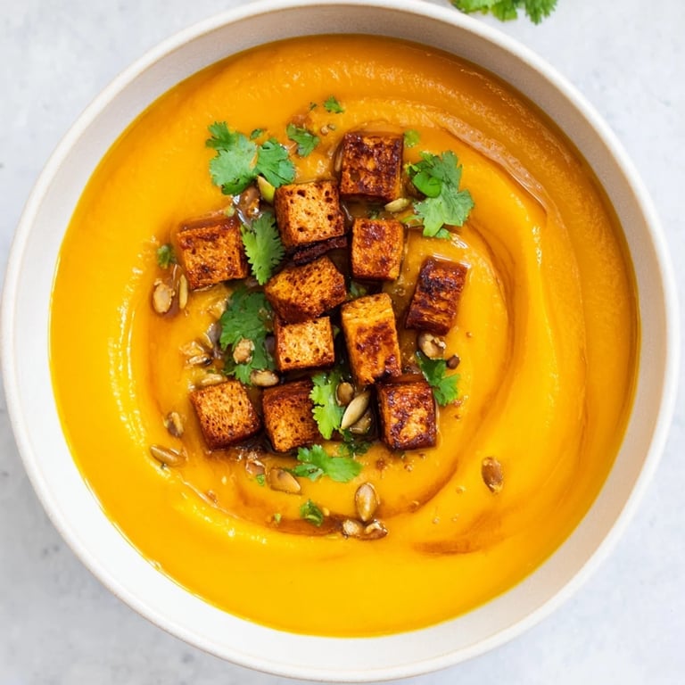 Je prépare cette soupe chaque automne, lorsque les marchés regorgent de potirons et que l'envie de plats réconfortants se fait sentir. Le contraste entre la soupe onctueuse et les croûtons de pain d&epice caramélisés plaît à toute ma famille.