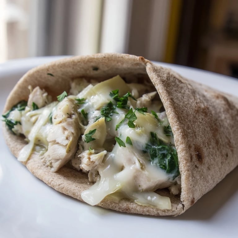 Épingler Un mardi soir pluvieux, j'ai improvisé ce plat avec ce qui traînait au frigo, et mes enfants l'ont tellement adoré qu'il est devenu un rituel du mercredi. La combinaison du poulet tendre, des cœurs d'artichauts et de l'épinard frais dans une pita chaude crée ce mélange parfait de réconfort et de fraîcheur.