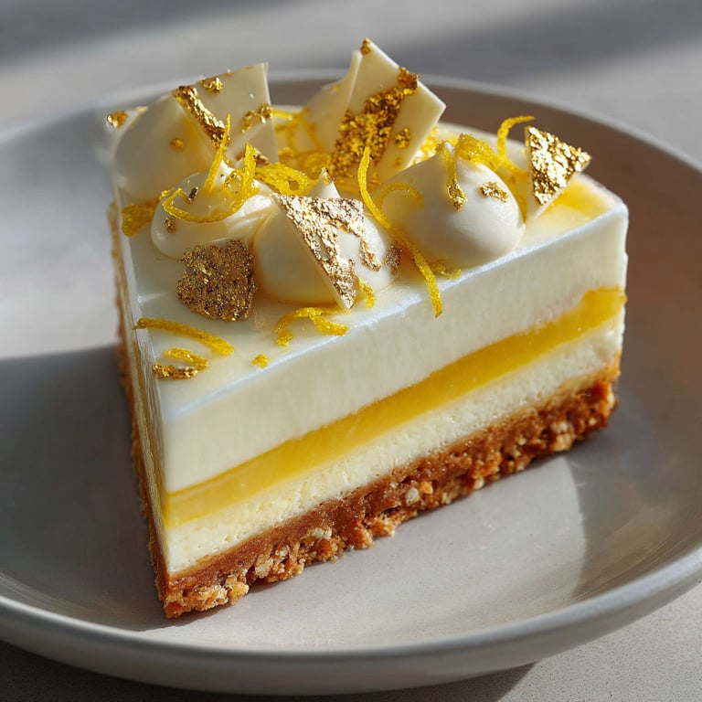Finition et décoration: Décorer la surface avec des éclats de chocolat blanc, du zeste de yuzu frais et quelques feuilles d’or alimentaire selon l’envie juste avant de servir.
