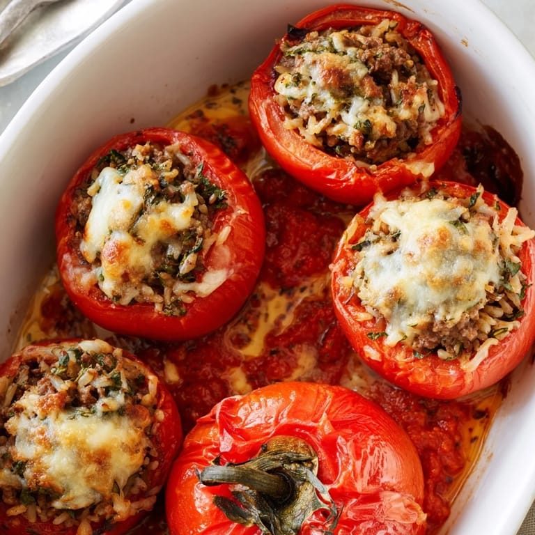Épingler Tomates juteuses remplies d'un mélange savoureux de viande hachée, cuites dans une sauce tomate aromatique et garnies de fromage fondu — un plat principal réconfortant et satisfaisant, parfait pour les dîners en famille.