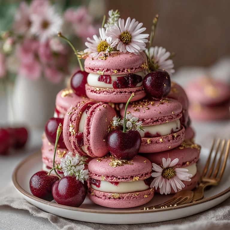 Épingler Cette tour de macarons aux cerises et chocolat ruby est autant une œuvre d’art qu’une explosion de saveurs. Chaque bouchée fait voyager, et l’effet sur les convives est inoubliable.